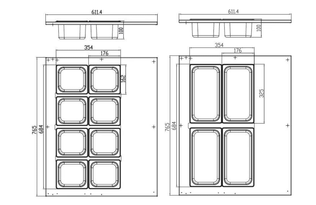 - Beregnet til 8 x 1/6 GN eller 4 x 1/3 GN beholdere (dybde 10 cm)