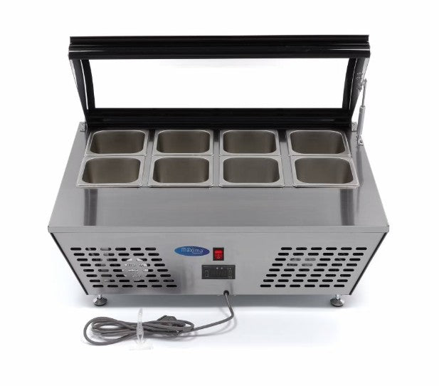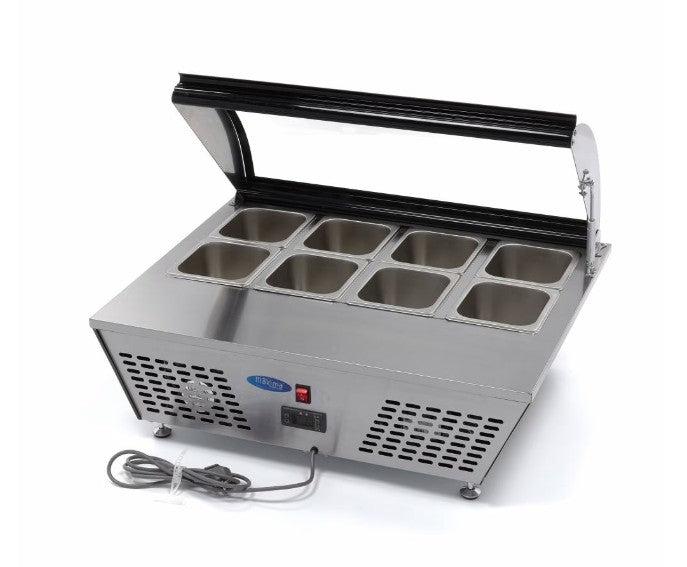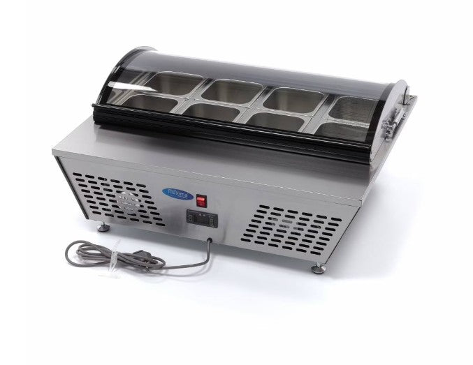 Denne mini salatbar er genial grundet sin praktiske størrelse, velegnet til køkkener med mindre plads eller baren. Under det stærke, hængslede glaslåg er der plads til 8 x 1/6 GN-bakker (medfølger) eller 4 x 1/3 GN-bakker til opbevaring af forskellige ingredienser på køl. Arbejdsområdet i rustfrit stål foran på saladetten kan bruges som et praktisk skærebræt. Den har en kapacitet på 67 liter.