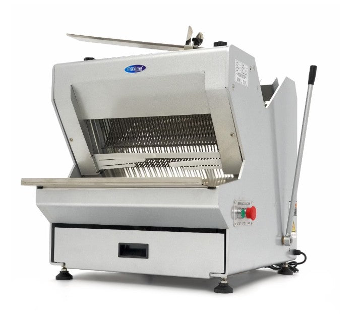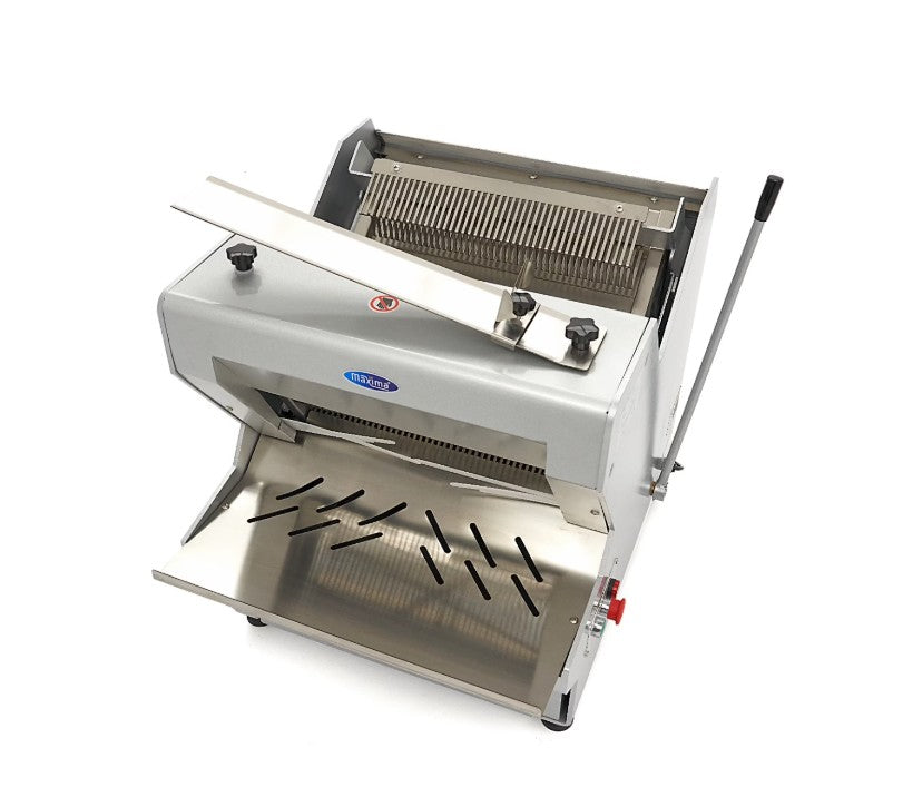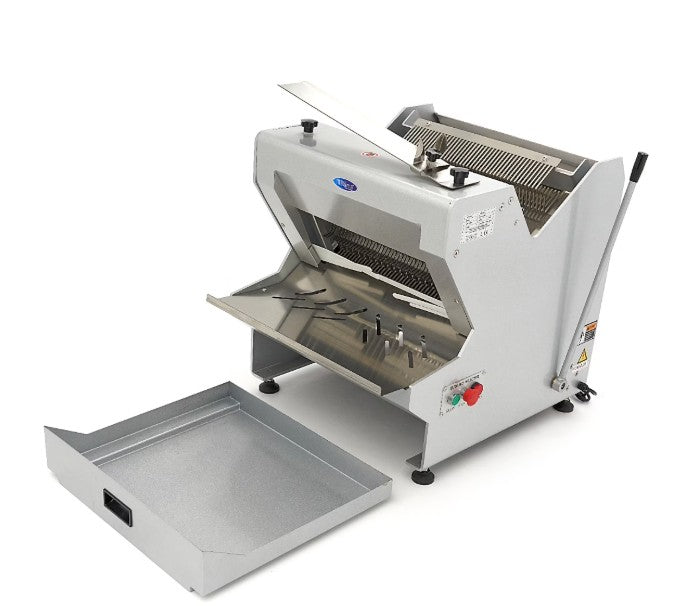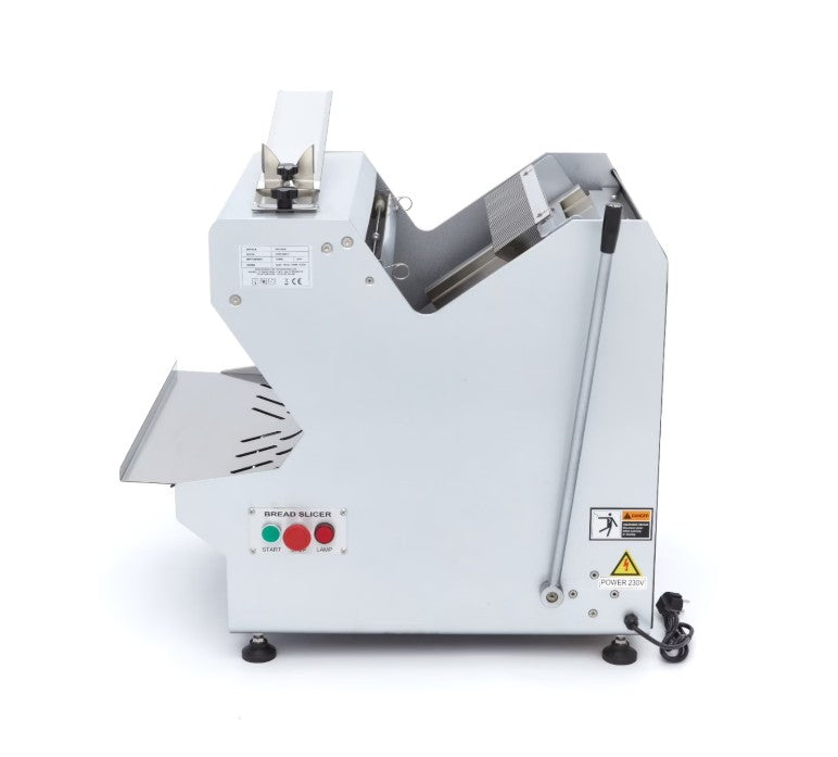 Denne brødskærer er lavet af belagt stål og er en holdbar maskine, der er designet til at skære forskellige typer brød. Brødskæreren kan vælges i forskellige modeller som skærer forskellige brødtykkelser. Denne maskine har savtakkede knive i rustfrit stål med en afstand på 10-11-12-13 mm.