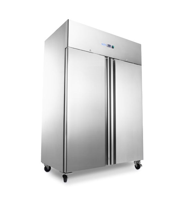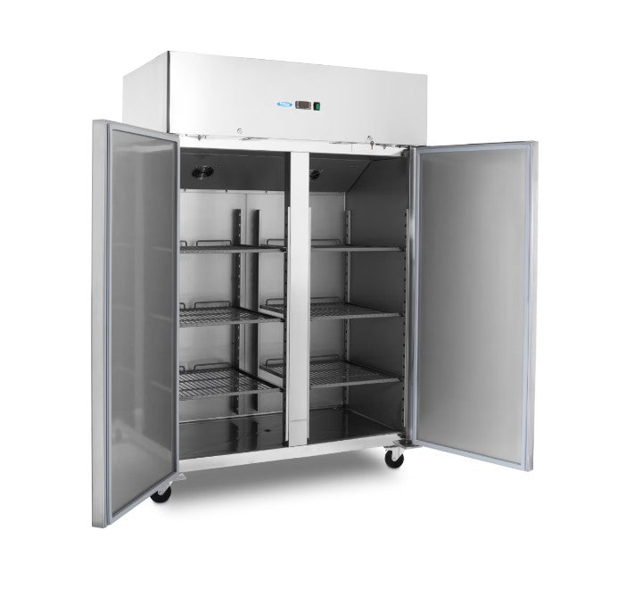 Mangel på køleplads hører fortiden til med dette 1400-liters køleskab i rustfrit stål. De to døre gør det nemt at nå dine produkter og fylde køleskabet. Det har også LED-belysning, som tænder, når du åbner døren.