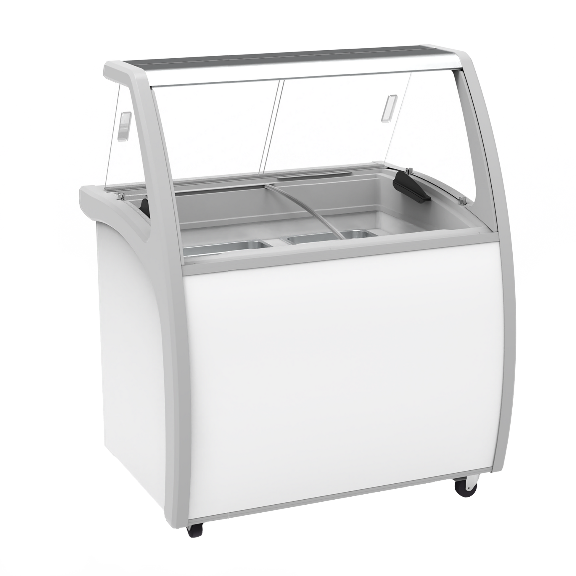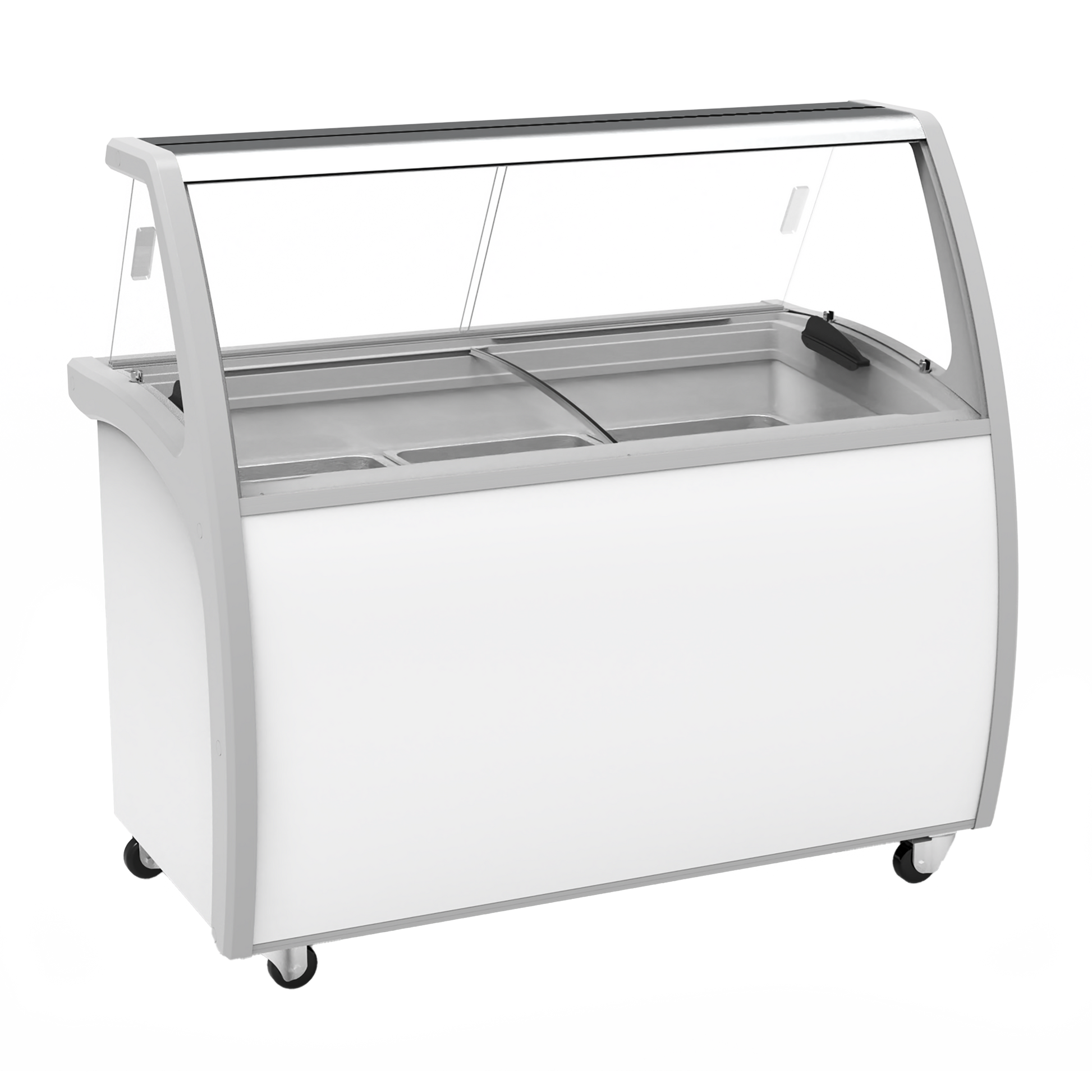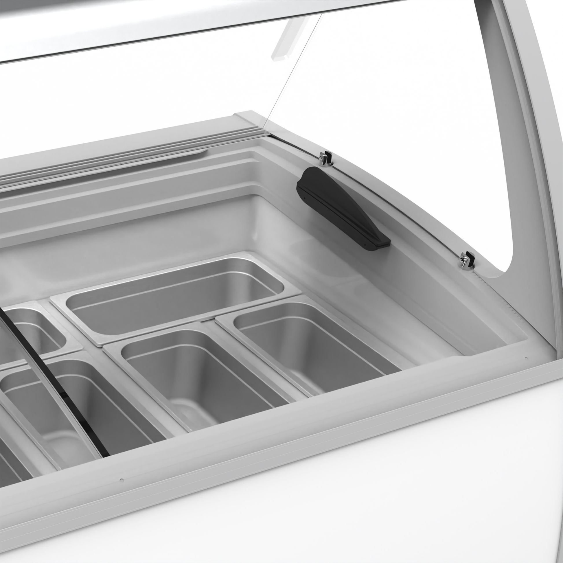 Elegant og funktionel isdisk til professionelt brug. Denne isdisk er designet til både funktionalitet og præsentation og leveres med en elegant, buet glasskærm, der fungerer som effektiv hygiejnebeskyttelse.