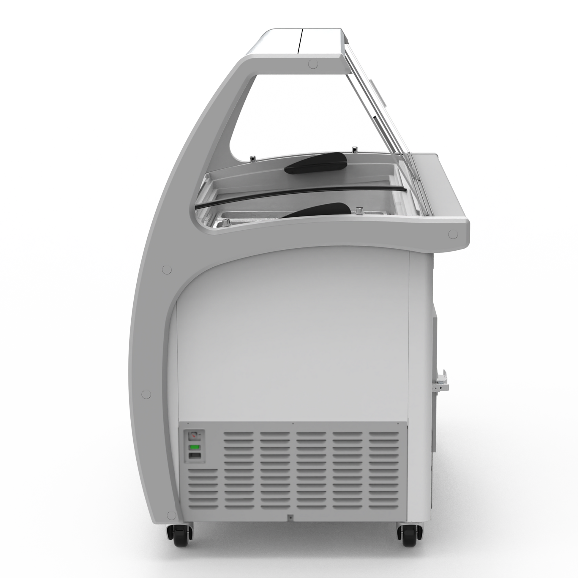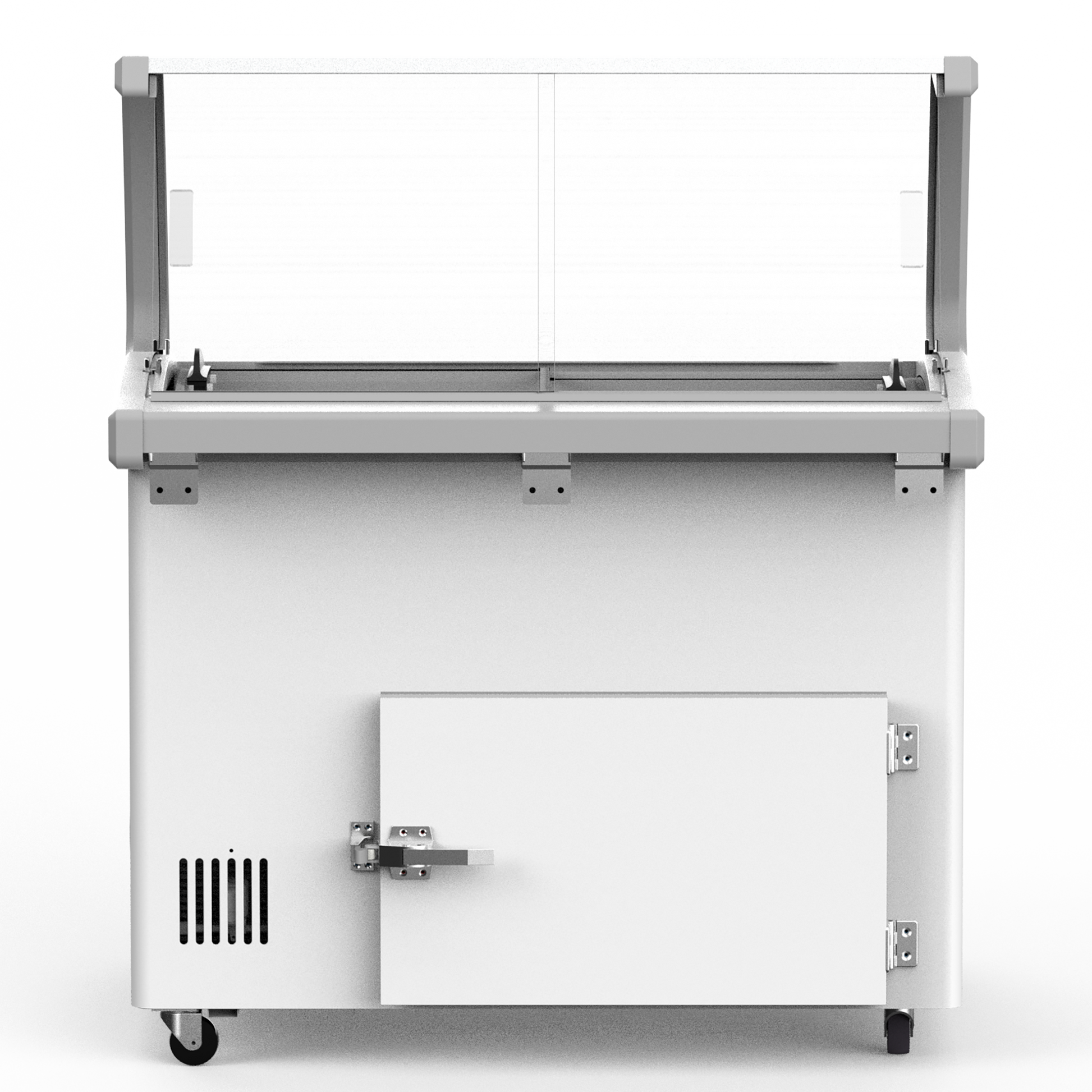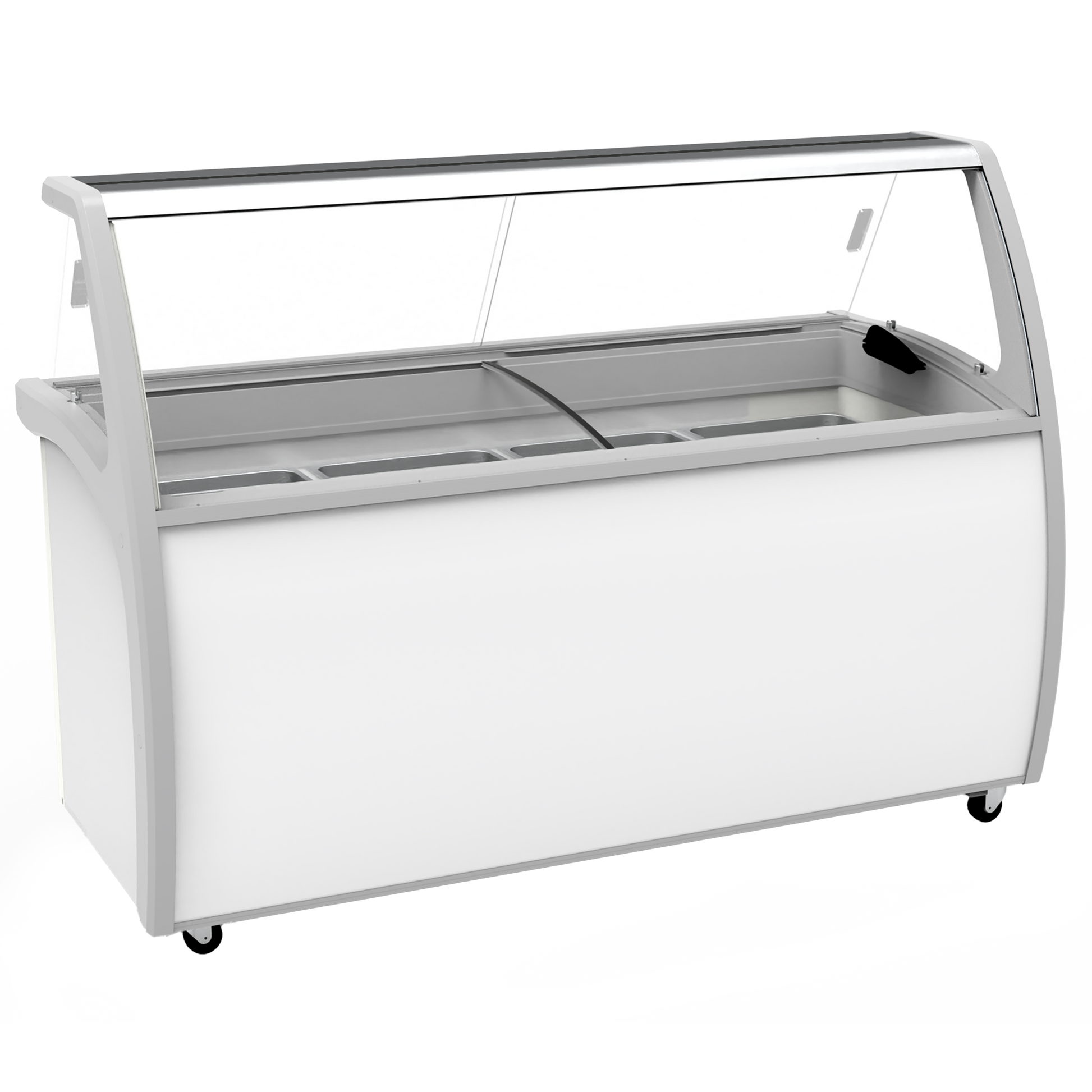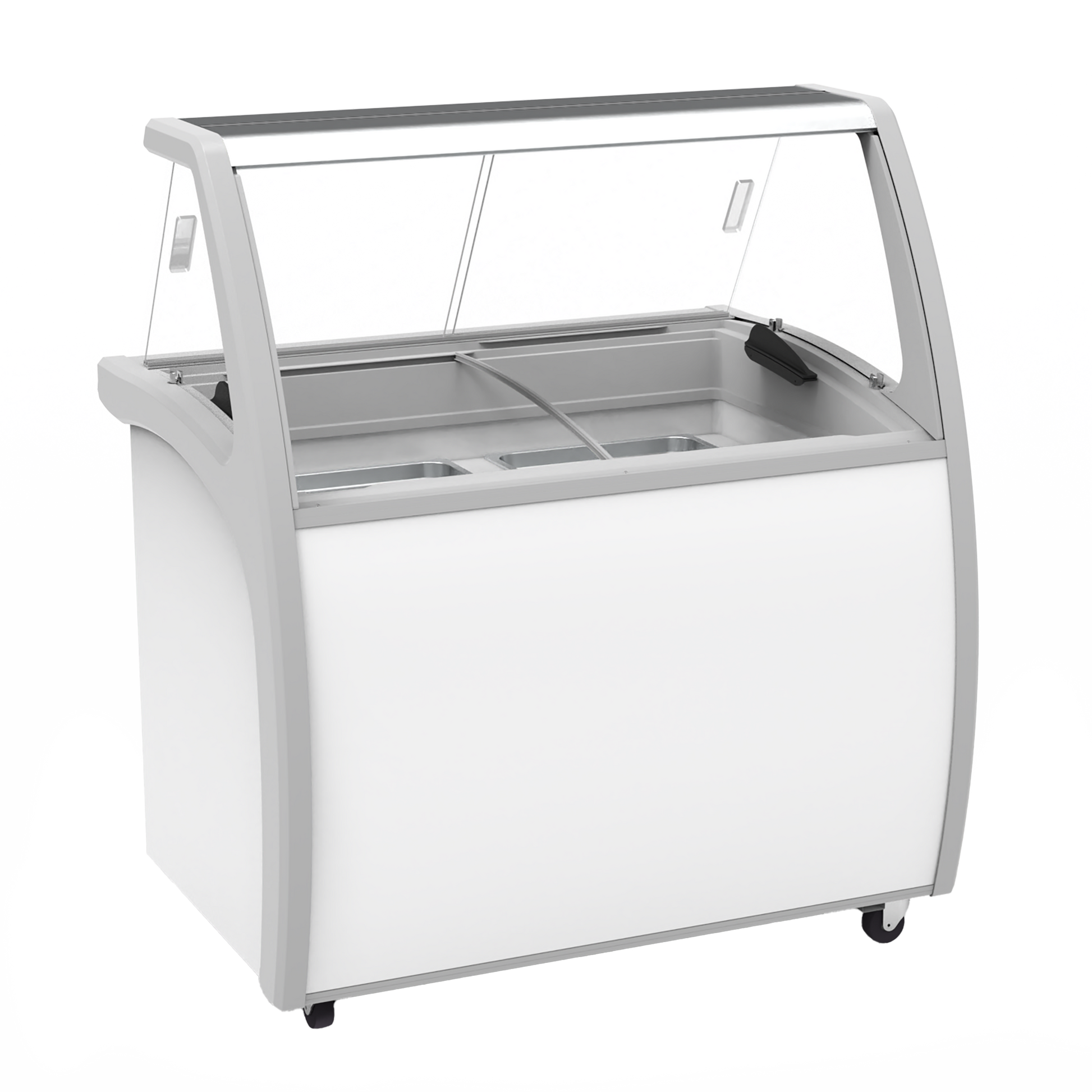 Elegant og funktionel isdisk til professionelt brug. Denne isdisk er designet til både funktionalitet og præsentation og leveres med en elegant, buet glasskærm, der fungerer som effektiv hygiejnebeskyttelse.