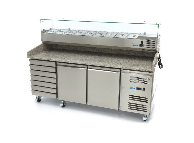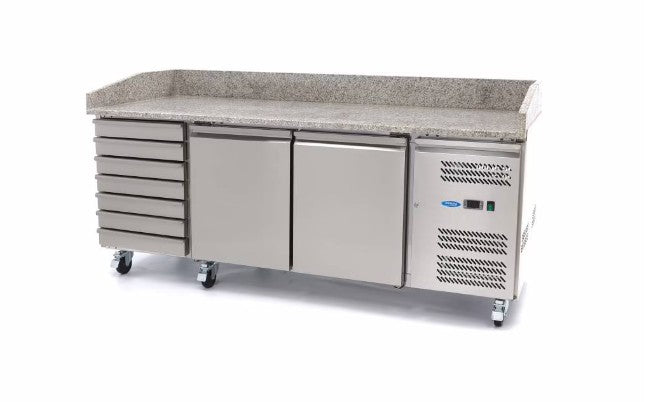 Hvis du tilbereder friske pizzaer med de lækreste toppings hver dag, så er denne smukke, nedkølede prep-station uundværlig i dit køkken. Den store granitplade på dette pizzakøleskab betyder, at dejen ikke hænger fast, og at den kan rulles ud og være klar til brug. Den leveres med hjul og en bremse, så den er nem at flytte.