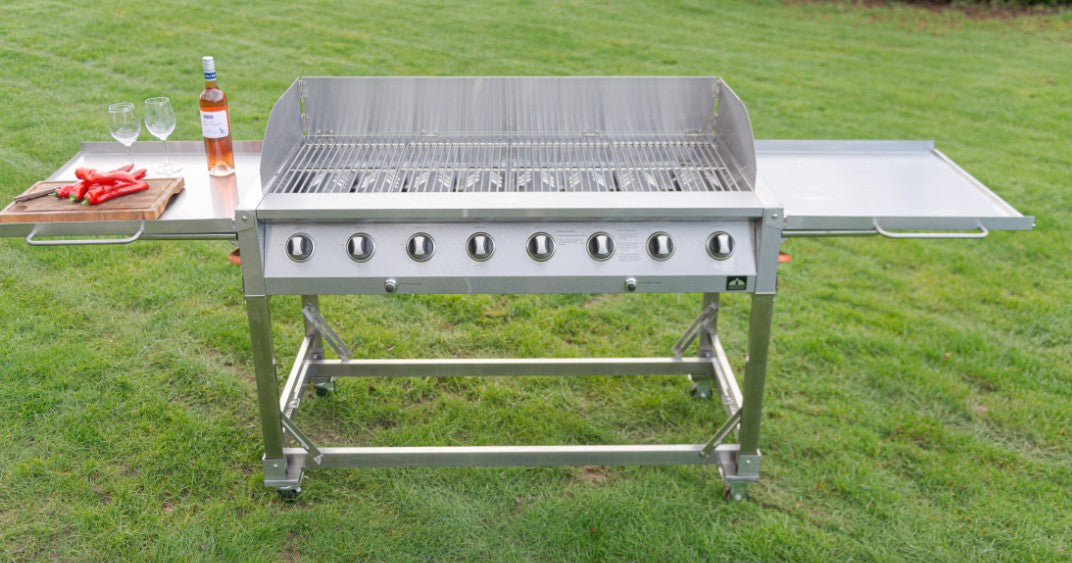 Gasgrill 8 er en stor robust gasgrill til to gasflasker. Det skal forstås sådan at én flaske dækker over 4 brændere, hvilket giver mulighed for højt udbytte på alle 8 brændere i flere timer, uden at glasflaskerne “fryser” til med is.